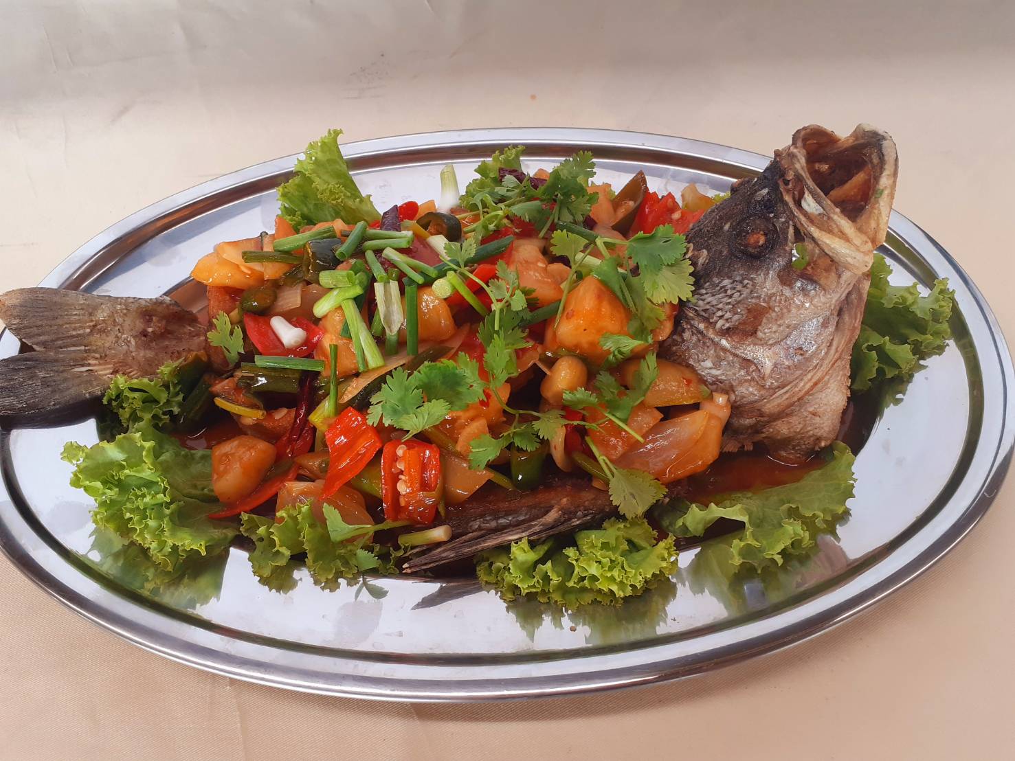 - ปลากะพงทอดน้ำปลา: ปลากะพงตัวโตทอดจนเหลืองทองกรอบนอกนุ่มใน เสิร์ฟคู่กับน้ำยำมะม่วงรสเด็ด
